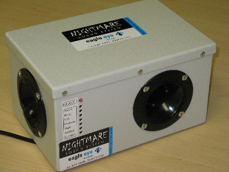 The AVITHOR NIGHTMARE Sound System uses ultrasonic sound waves from 10078 hertz up to 15354 hertz to discourage birds such as starlings and Indian mynas from roosting over night. The sound output is non-repeating, and even the output time is varied between 450 and 2500 milliseconds, so the birds do not become accustomed to the sound pattern.